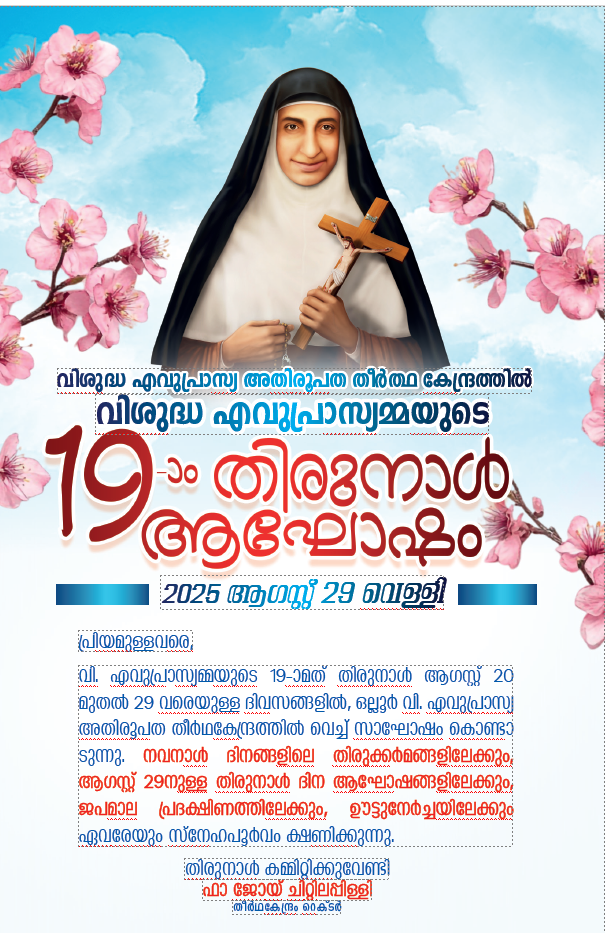 വി. എവുപ്രാസ്യമ്മയുടെ 19-ാമത് തിരുനാൾ ആഗസ്റ്റ് 20 മുതൽ 29 വരെയുള്ള ദിവസങ്ങളിൽ, ഒല്ലൂർ വി. എവുപ്രാസ്യ അതിരൂപത തീർഥകേന്ദ്രത്തിൽ വെച്ച് സാഘോഷം കൊണ്ടാ ടുന്നു. നവനാൾ ദിനങ്ങളിലെ തിരുക്കർമങ്ങളിലേക്കും, ആഗസ്റ്റ് 29നുള്ള തിരുനാൾ ദിന ആഘോഷങ്ങളിലേക്കും, ജപമാല പ്രദക്ഷിണത്തിലേക്കും, ഊട്ടുനേർച്ചയിലേക്കും ഏവരേയും സ്നേഹപൂർവം ക്ഷണിക്കുന്നു.